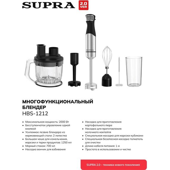 Многофункциональный блендер( набор - кубик), максимальная мощность: 2000 Вт, бесступенчатое управление одной кнопкой, усиленное лезвие блендера из нержавеющей стали: 2 лепестка, большая чаша для измельчения, нарезки и терки продуктов: 1250 мл, мерный стакан: 700 мл, насадка венчик для взбивания , насадка для приготовления картофельного пюре, насадка для приготовления молочного коктейля, специальная насадка для нарезки кубиками, специальная безопасная насадка толкатель для очистки, длина кабеля питания: 1 м.