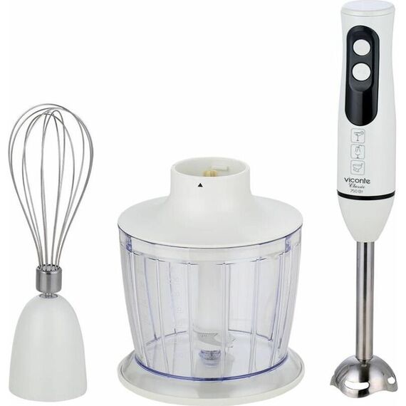 Погружной блендер Viconte VC-4441 800 W, Погружной блендер, мощность 800W, современный эргономичный дизайн, пульсовый режим работы, 2 скорости, лезвия из нержавеющей стали, металлическая нога блендера, венчик для взбивания, чаша с ножом для рубки и измельчения, 600 мл; автоматическая блокировка при неправильно установленной насадке, удобство и простота в обращении и чистке.