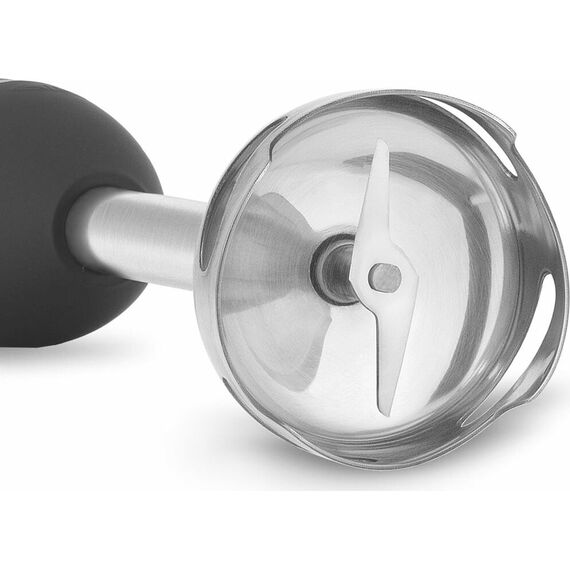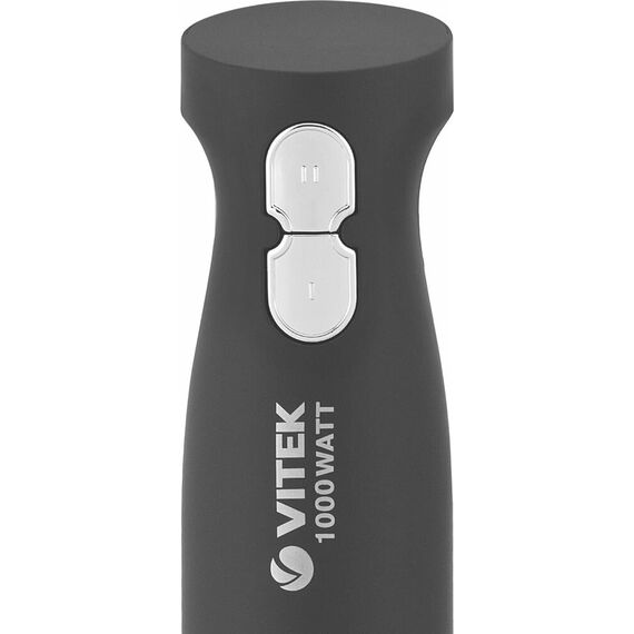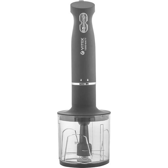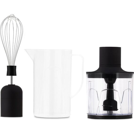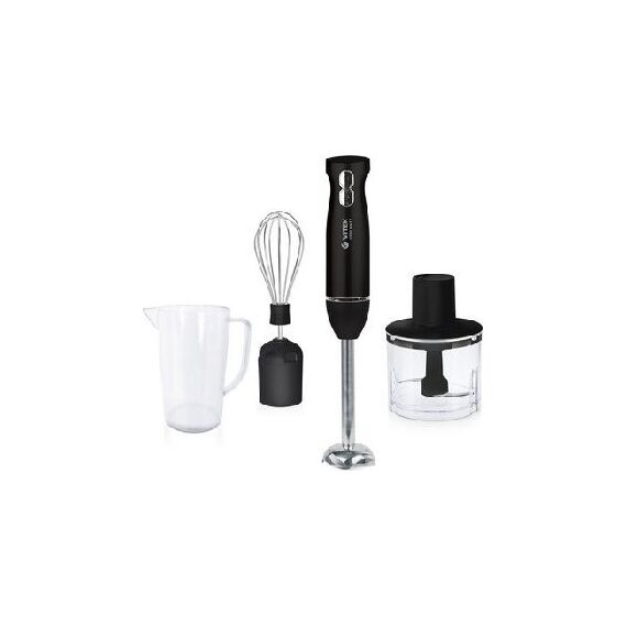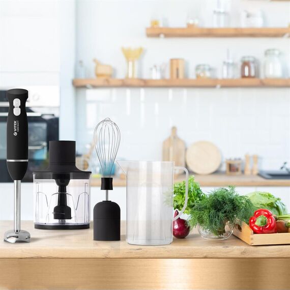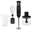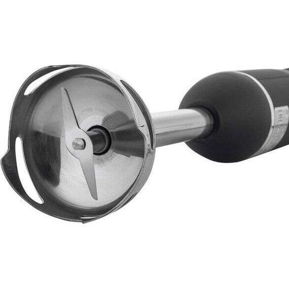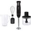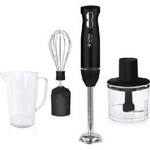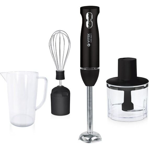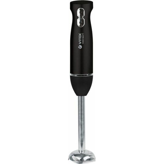 Блендер погружной. Мощность: 1000 вт, Количество скоростей: 2, Управление: механическое, Материал корпуса: пластик, Материал погружной части: нержавеющая сталь, Емкость измельчителя: 500 мл, Емкость мерного стакана: 800 мл, Венчик для взбивания, Длина сетевого шнура: 110см, Цвет: Черный