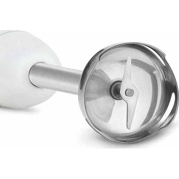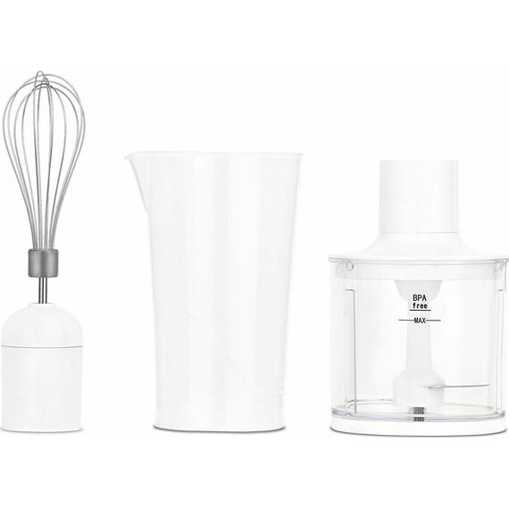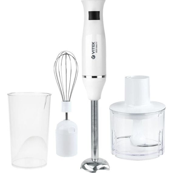 Блендер погружной. Мощность: 800 вт, Количество скоростей: 1, Управление: механическое, Материал корпуса: пластик, Материал погружной части: нержавеющая сталь, Емкость измельчителя: 450 мл, Емкость мерного стакана: 700 мл, Венчик для взбивания, Длина сетевого шнура: 110см, Цвет: Белый