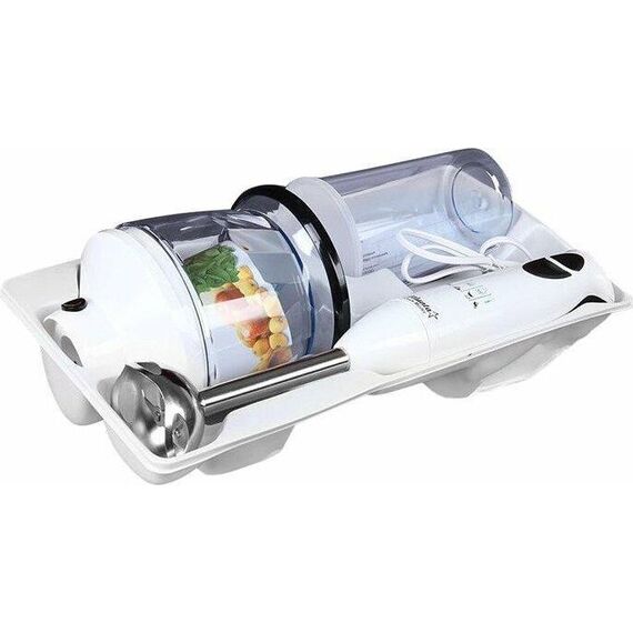 Удобная анатомическая форма ручки Две скорости работы Насадка блендера изготовлена из высокопрочной пищевой стали Чаша – измельчитель удобна в использовании и подходит для небольших объемов Емкость объемом 1 литр с крышкой идеальна для приготовления жидкого теста, коктейлей и пюре Обороты до 11000 в минуту Номинальная мощность 280 Вт 230 B ~ 50 Гц