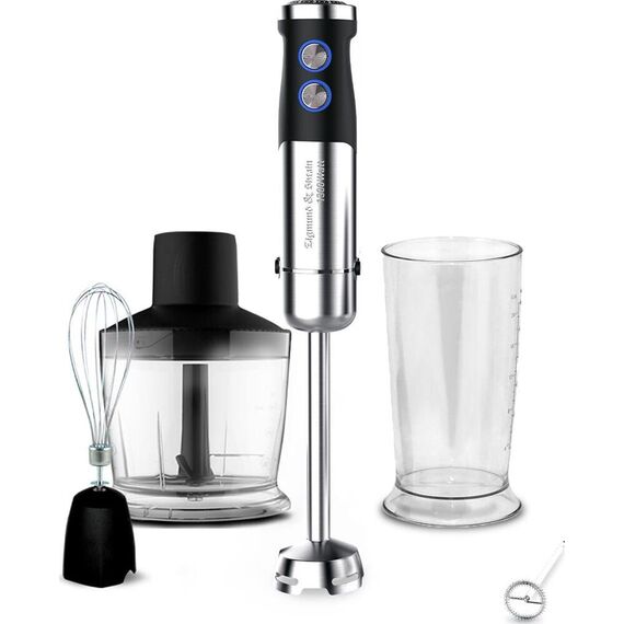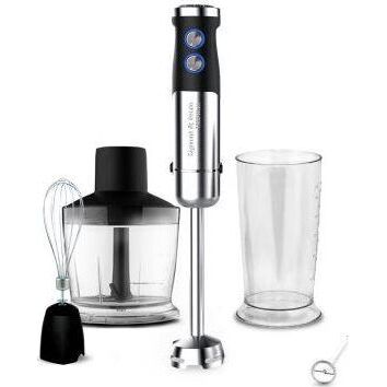 Блендер погружной многофункциональный 4 в 1 Мощность: 1300 Вт Напряжение: 220-240В, 50/60Гц Объем чаши: 0.8л Объем стакана: 0.6л Кол-во скоростей: 12 Импульсный режим (турбо): да LED подсветка кнопок Тип двигателя: DC