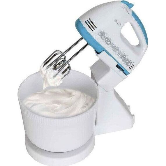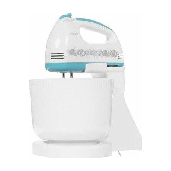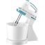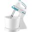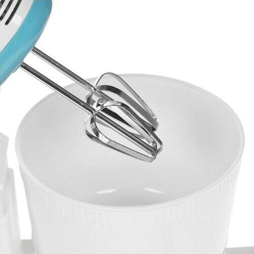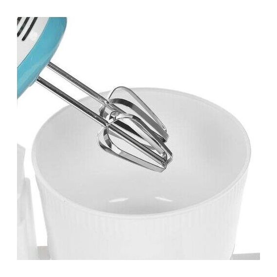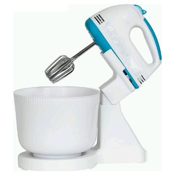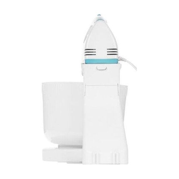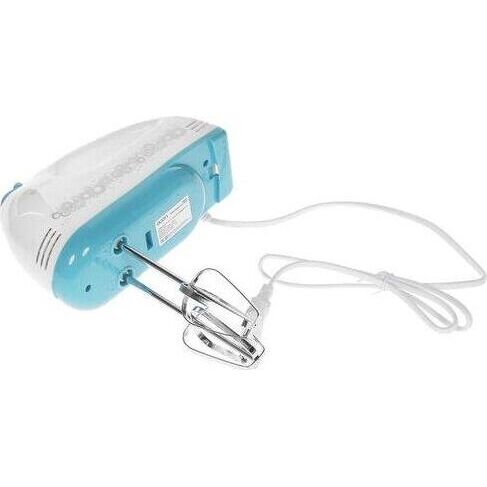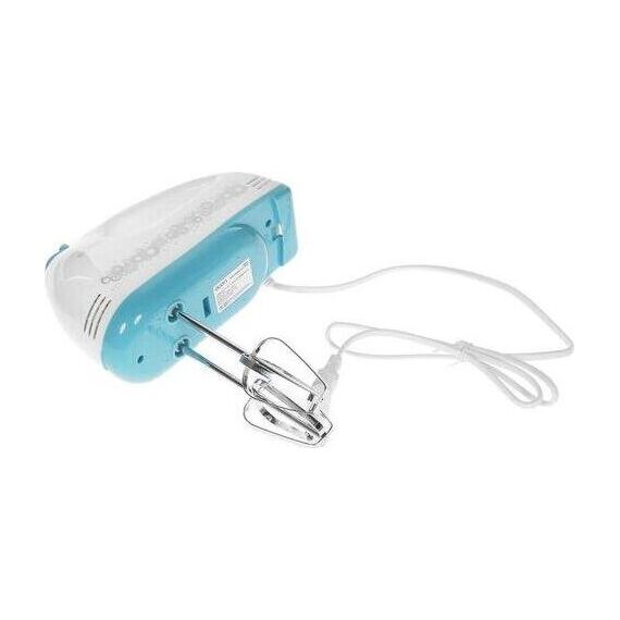 Миксер ручной с чашей, Механический, Объем чаши 2 литра, Максимальная мощность 300 Вт, 7 скоростей, Насадки для взбивания яиц, крема, теста, Маетриал корпуса - пластик, Цвет корпуса белый с синим.