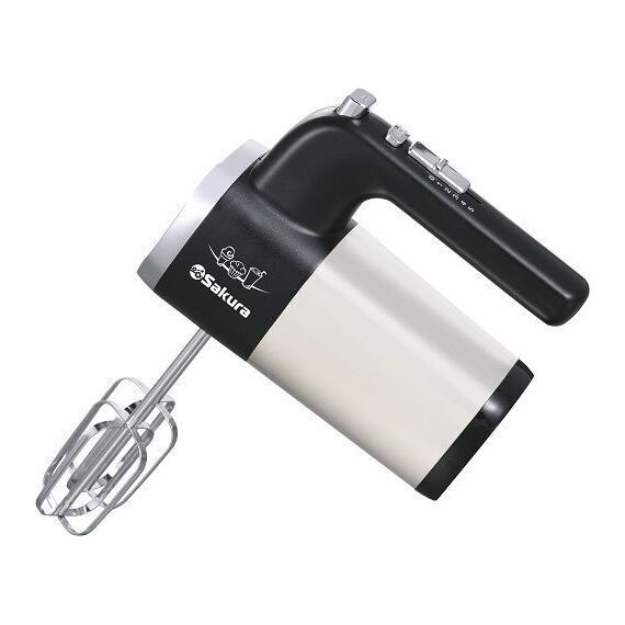 Ручной миксер, мощность 600 Вт, 5 скоростей работы + турбо-скорость, защита от перегрева, корпус и насадки из нержавеющей стали, в комплекте венчики для взбивания и крюки для замешивания теста.