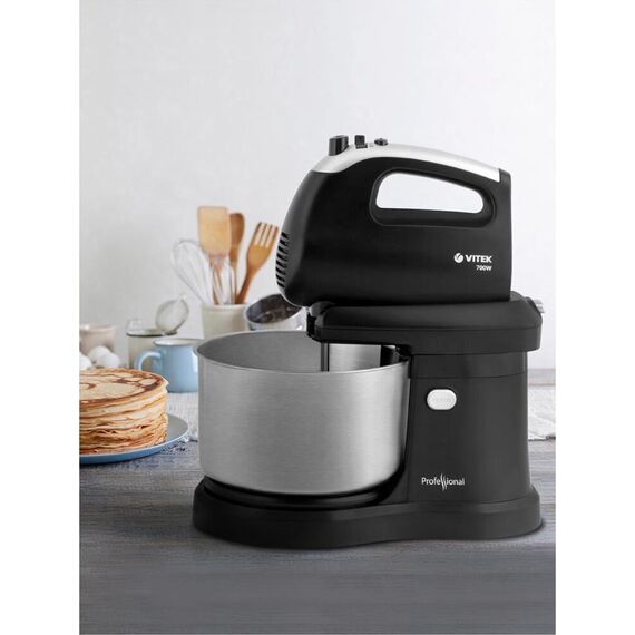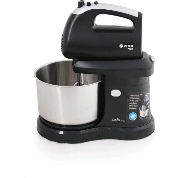 Миксер ручной с чашей. Мощность: 700 вт, Число скоростей: 5, Турборежим, Венчик для взбивания: 2, Крюки для замешивания теста, Количество насадок: 4, Вращение чаши, Материал чаши: сталь, Объем чаши: 2,8 литра, Кнопка отсоединения насадок, Материал корпуса: пластик, Лопатка в комплекте, Длина сетевого шнура: 120 см, Цвет: Черный