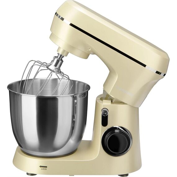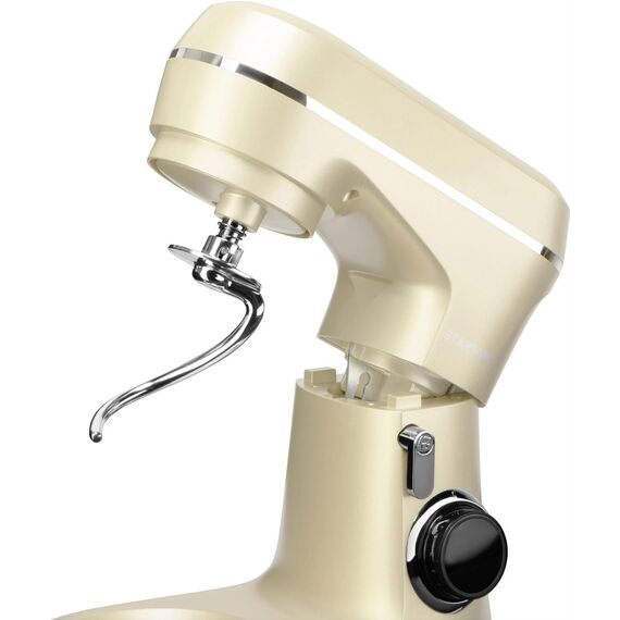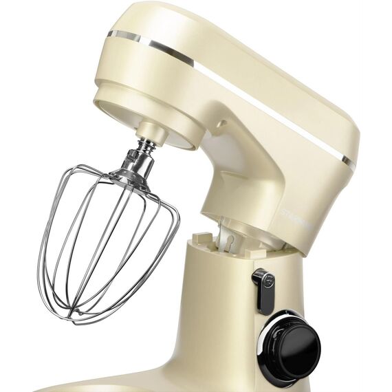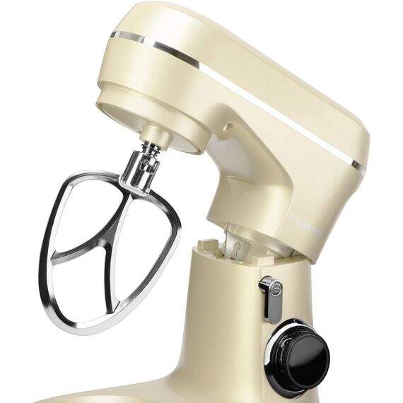 1300 Вт 8 скоростей, импульсный режим. В комплект входит венчик для взбивания, крюки для теста,лопатка для перемешивания, защитный обод 3 насадки Материал чаши — нержавеющая сталь Ёмкость чаши 4,5 л Прорезиненные ножки Цвет бежевый Срок гарантии 12 мес