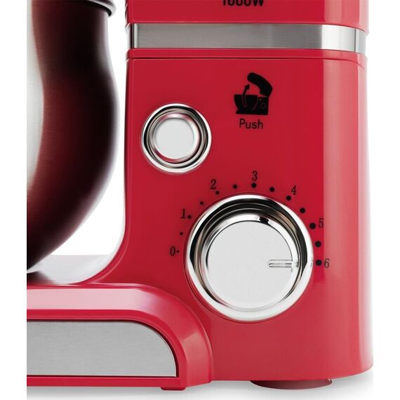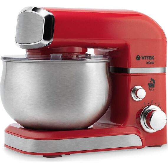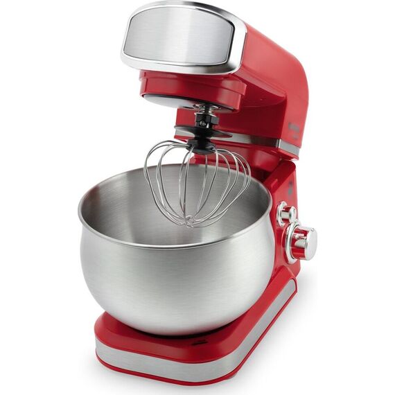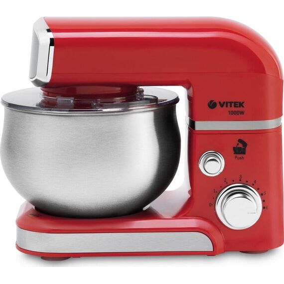 Планетарный миксер. Мощность: 1000 вт, Число скоростей: 6, Венчик для взбивания: 1, Крюки для замешивания теста, Количество насадок: 3, Защитная крышка на чашу, Материал чаши: нержавеющая сталь, Объем чаши: 3,5 литра, Планетарное вращение насадок, Прозрачная крышка для чаши с окном для добавления ингредиентов, Материал корпуса: пластик, Лопатка в комплекте, Длина сетевого шнура: 100см, Цвет: Красный