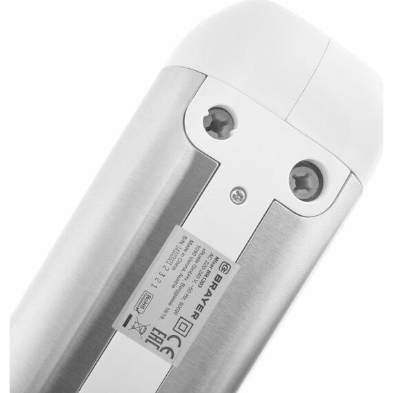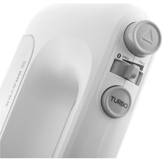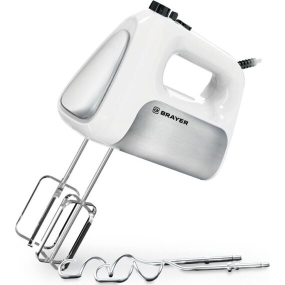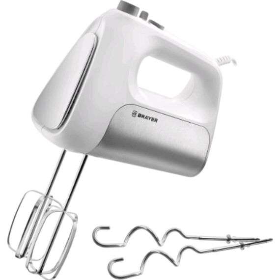1303BR Миксер BRAYER, 500 Вт, корп.из нерж.стали, 5 режимов, 2 крюка, 2 венчика Мощность 500 Вт. 5 скоростных режимов 2 венчика для взбивания 2 крюка для замешивания теста Турборежим Кнопка для освобождения насадок