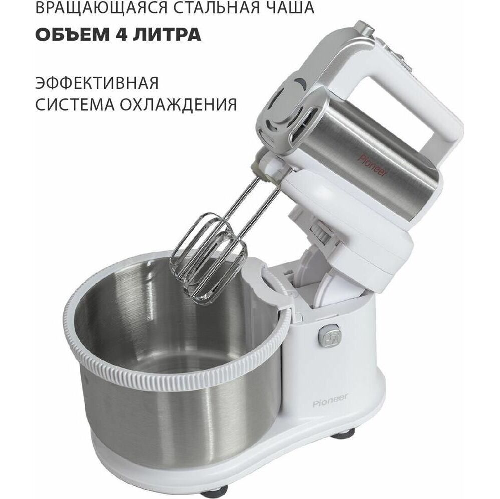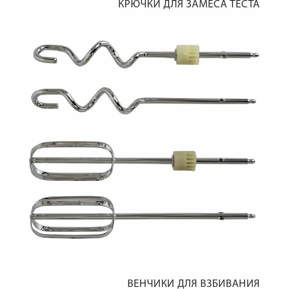 Миксер 2 в 1, ручной + стационарный, максимальная мощность 450 ватт, объем чаши 4 литра, автоматическая вращающаяся чаша, 5 скоростей, режим - Турбо, пониженный уровень шума, веньчики для взбивания яиц и крема, крючки для замеса теста