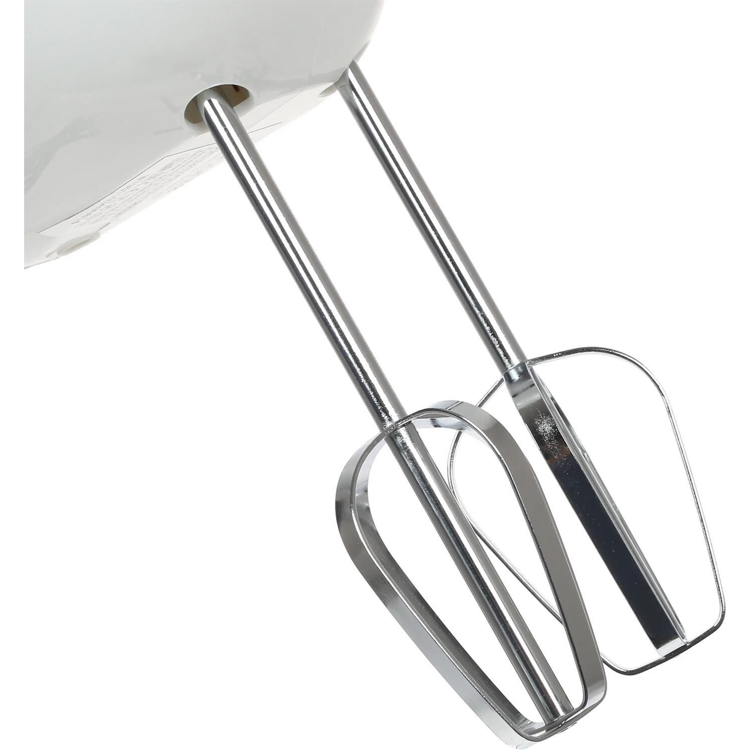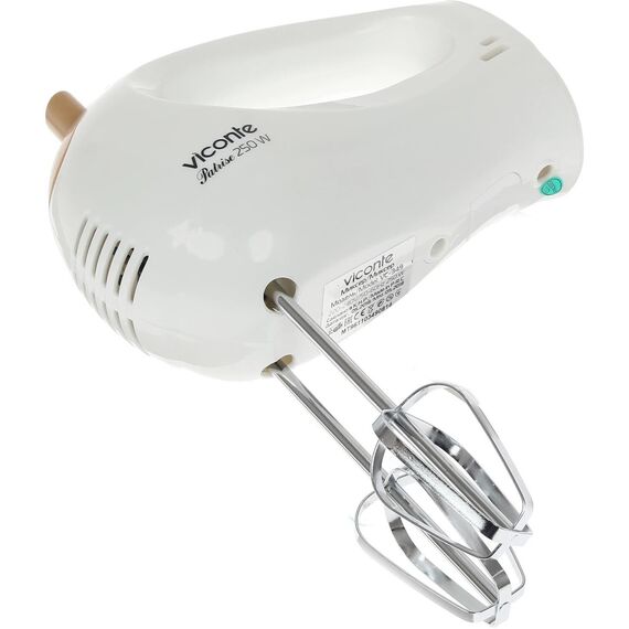 Миксер, 250W, 5 скоростей работы, кнопка извлечения насадок, двойной набор насадок: два венчика для взбивания яиц и кремов, две насадки для размешивания тяжелого теста, смешивание жидкостей, замешивание теста, приготовление пюре, взбивание сливок и белков.