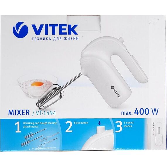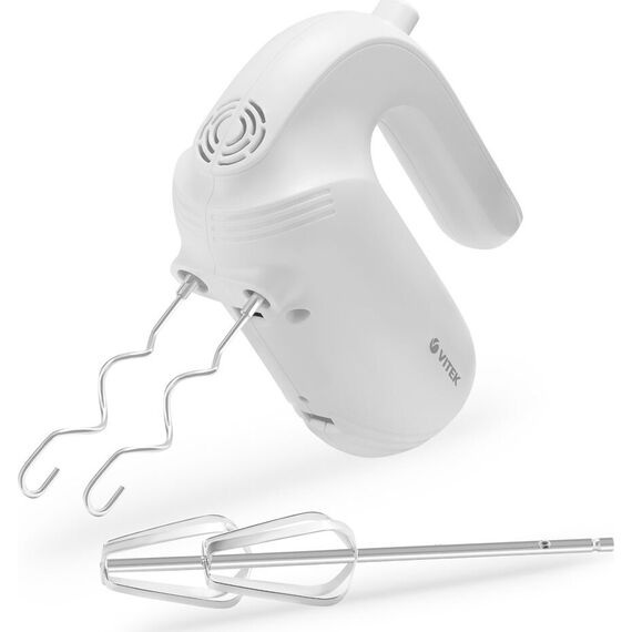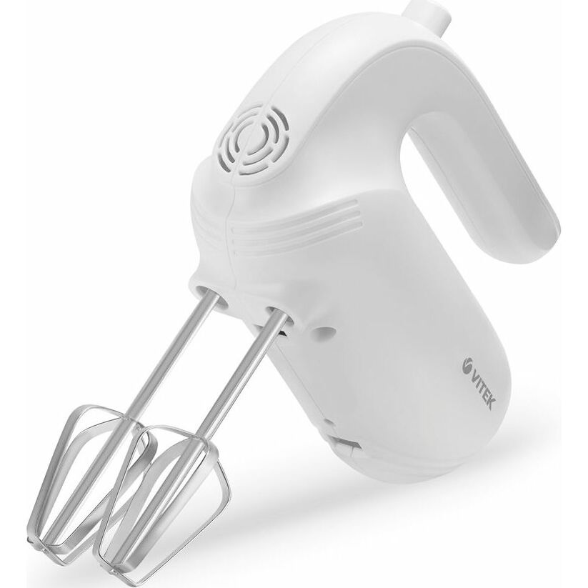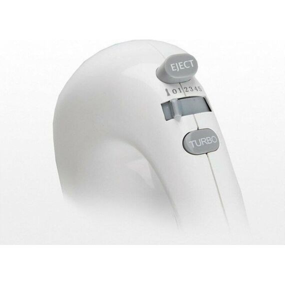 Миксер ручной. Мощность 400 вт, Число скоростей: 5, Венчик для взбивания: 2, Крюки для замешивания теста, Количество насадок: 4, Кнопка отсоединения насадок, Материал корпуса: пластик, Длина сетевого шнура: 120 см, Цвет: Белый