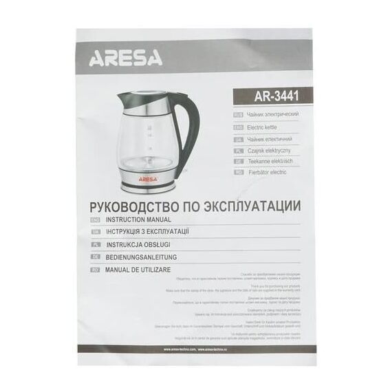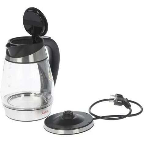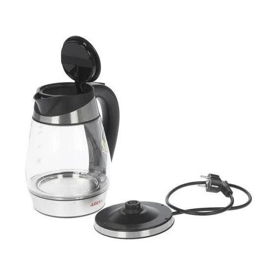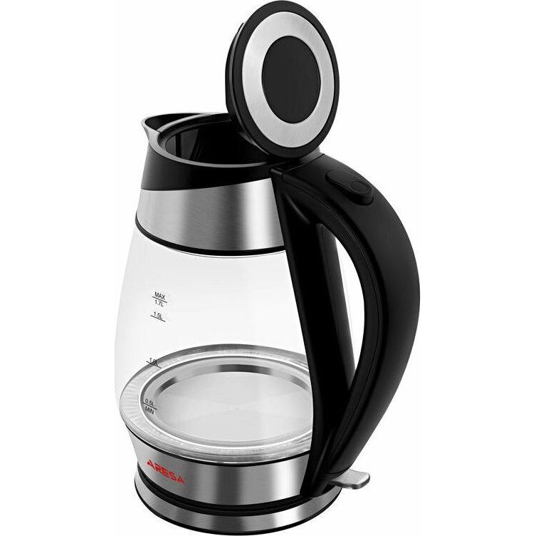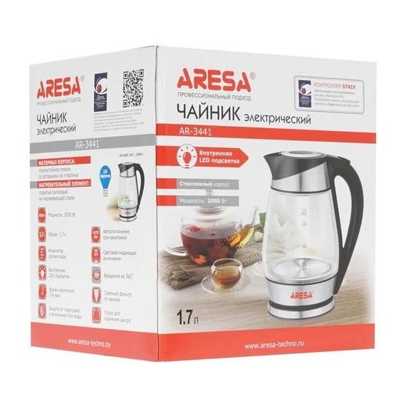 ARESA AR-3441 220-240В, 50 Гц, 2000 Вт Объем – 1,7л Вращение на 360" Корпус из термостойкого стекла Скрытый нагревательный элемент из нержавеющей стали Внутренняя LED подсветка Световая индикация включения Время закипания - 3-5 мин. Автоотключение при закипании Защита от перегрева и включения без воды Съемный фильтр от накипи Отсек для хранения шнура