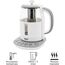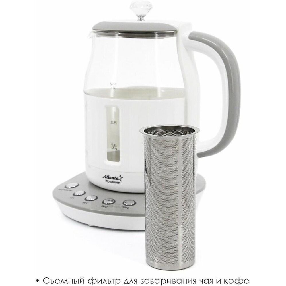 Объем 1,5 литра 5 режимов нагрева и поддержания температуры 70/80/90/100°С Корпус из термостойкого стекла Цифровой контроллер температуры Шкала уровня воды Поворот на подставке на 360° Быстрое закипание Фильтр от накипи Закрытый нагревательный элемент Автоматическое отключение Защита от перегрева без воды Электрошнур в цокольной подставке, 66см Мощность 1850-2200 Вт 220-240 B ~ 50/60 Гц