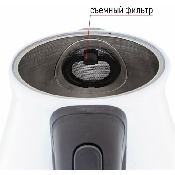 Чайник электрический, объем 1,7л, максимальная мощность 2200 Вт, встроенный в корпус датчик температуры воды, индикатор уровня воды, съемная крышка, фильтр от накипи, защита от включения без воды, автоматическое отключение при закипании, вращение на 360 градусов, хранение электрошнура в подставке, корпус из нержавеющей стали покрытый спреем, цвет: белый