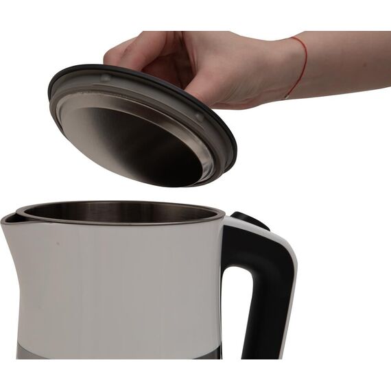 Цвет Белый+черный Материал полости Нержавеющая сталь Параметры электросети, В/Гц 220-240/50-60 Мощность, Вт 2200 Объем, л 1,7 Автоотключение Защита от включения без воды 360° поворот корпуса Съемная крышка Двойные стенки Удобное широкое горлышко Световая индикация