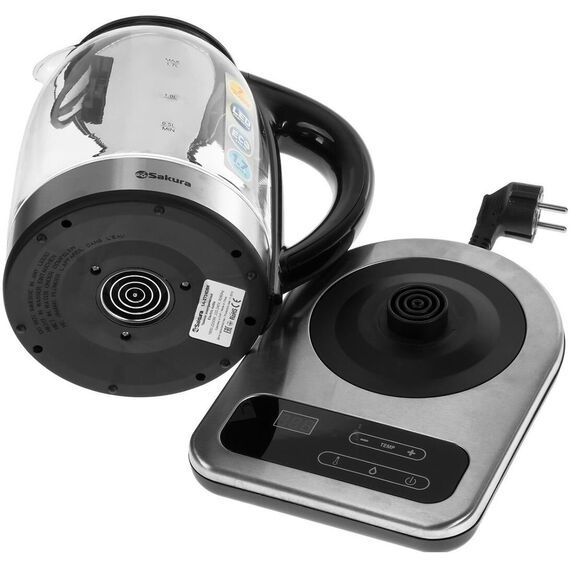 SAKURA SA-2724DBK 1,7 л, 1850-2200 Вт, стеклянный корпус, диск, 7 температурных режимов (40, 50, 60, 70, 80, 90, 100С), поддержание температуры, сенсорное управление, LED дисплей, функция дехлорирования, отключение при закипании и включении без воды