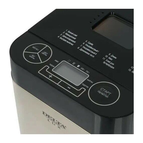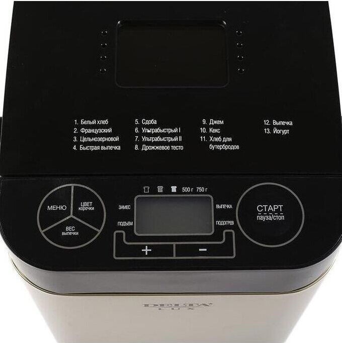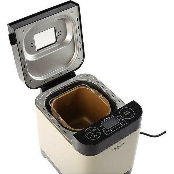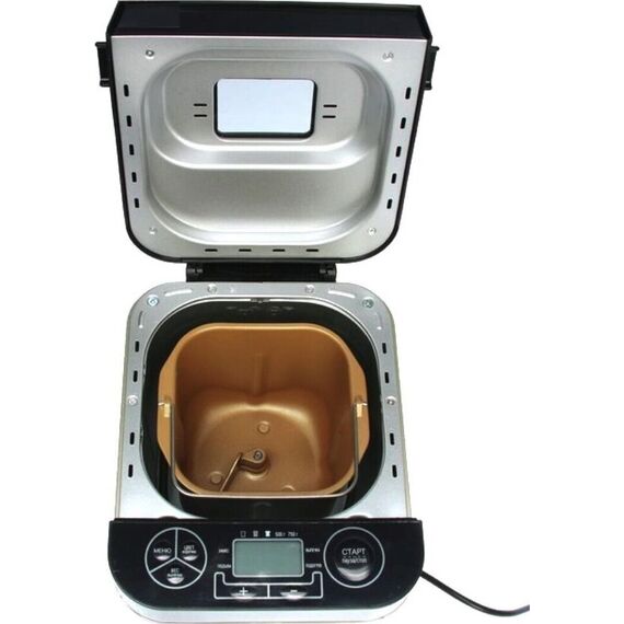 мощность 500 Вт Вес выпечки 500/750 г Объем формы для выпечки 0,7 л Объем мерного стакана 0,2 л Описание Прибор предназначен для выпекания хлебобулочных изделий, замеса теста для последующей выпечки в духовке, а также для приготовления джема и варенья в бытовых и аналогичных условиях Корпус из высококачественной нержавеющей стали и пластика Цвет: золотистый с черным Форма для выпечки и тестомешалка с антипригарным покрытием Сенсорная панель управления LCD-дисплей Мерный стакан 200 мл Двухсторонняя мерная ложка: 1 чайная ложка и 1 столовая ложка Функция «Отложенный старт» до 13 часов Функция сохранения тепла «Автоподогрев» 1 час Энергонезависимая память до 10 минут Выбор веса выпечки: 500 г/750 г Выбор цвета корочки: светлая, средняя, темная Возможность добавления дополнительных ингредиентов Звуковые сигналы, сопровождающие процесс приготовления 13 автоматических программ выпечки и приготовления: белый хлеб французский хлеб цельнозерновой хлеб быстрая выпечка