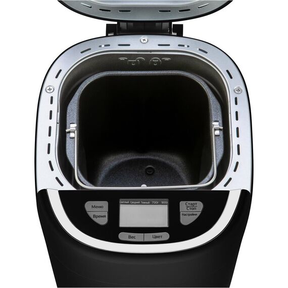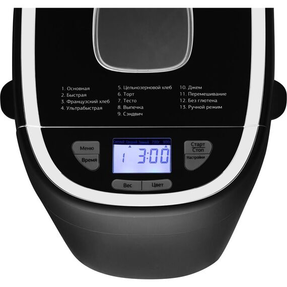 Хлебопечь. Мощность 550 Вт. Максимальный вес выпечки 900г. Количество размеров выпечки 700/900г. Регулировка веса выпечки. Формы выпечки: буханка. Антипригарное покрытие формы. Программ приготовления 13. Поддержание температуры. Выбор цвета корочки. Цвет черный. Материал корпуса: пластик.