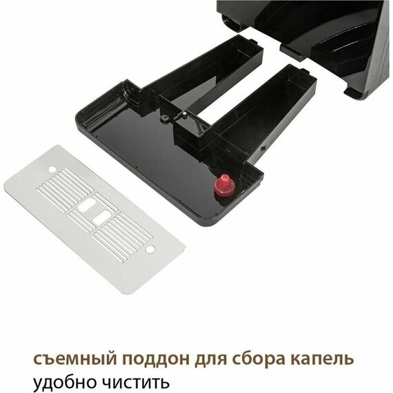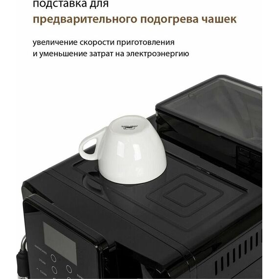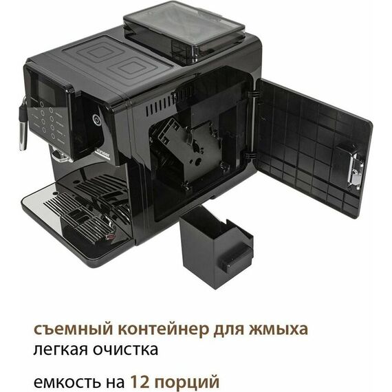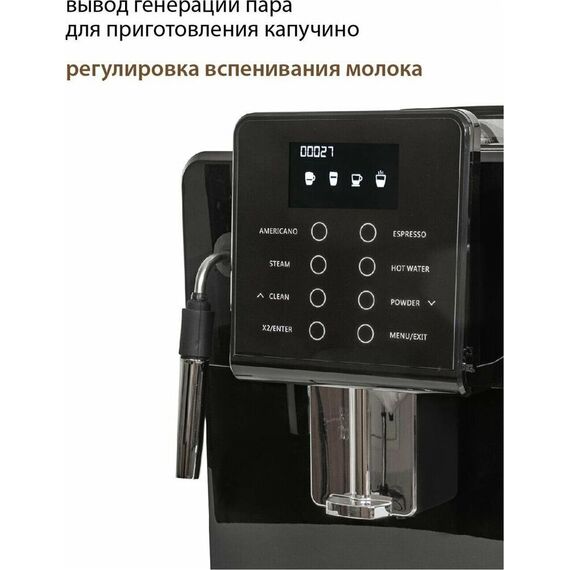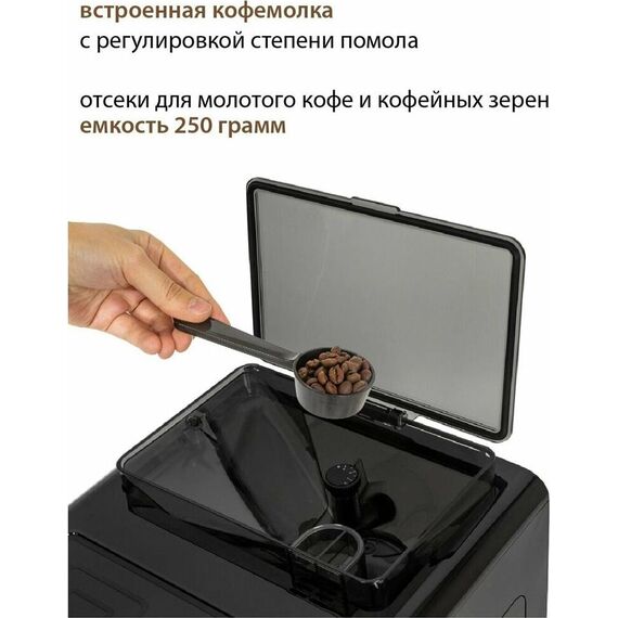 Кофемашина для автоматического приготовления американо и эспрессо со встроенной кофемолкой. Мощность 1350 Вт. Интуитивно понятный многофункциональный ЖК-дисплей с сенсорными кнопками управления. Вывод генерации пара для приготовления капучино. Настройка крепости и температуры. Емкость контейнера для зерен: 250 грамм. Регулировка степени помола кофе от 1 до 5. Регулировка объема порции кофе от 20 до 250 мл. Регулировка высоты диспенсера: 70–130 мм (95–145 мл). Съемный резервуар для воды. Съемный варочный узел для легкой очистки. Счетчик порций. Резервуар для воды: 1,7 литра. Давление помпы ARS (Италия): 19 Бар. Емкость контейнера для отработанного кофе:12 порций. Автоматическая подача воды в резервуар. Индикация работы, пополнения воды и кофейных зерен, необходимости очистки от накипи. Цвет: черный