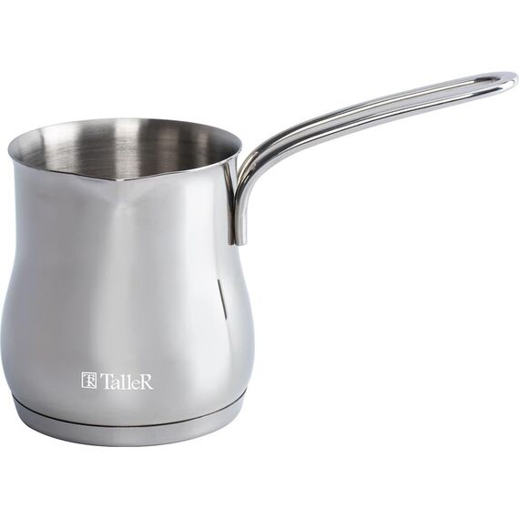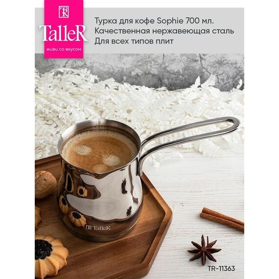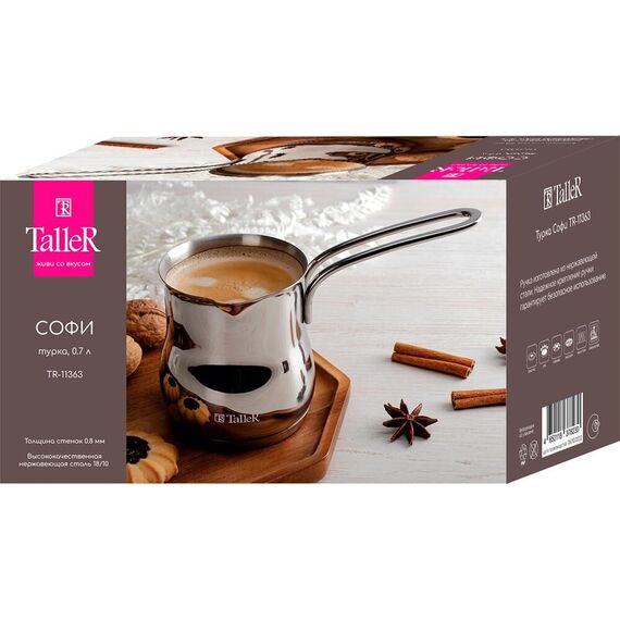 Турка 0,7 л Софи Материал: нержавеющая сталь, толщина стенки 0,8 мм, толщина дна 4.0 мм Рекомендации: подходит для всех типов плит, влючая индукционные. Пригодна для мойки в посудомоечной машине Упаковка - цветная коробка