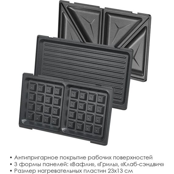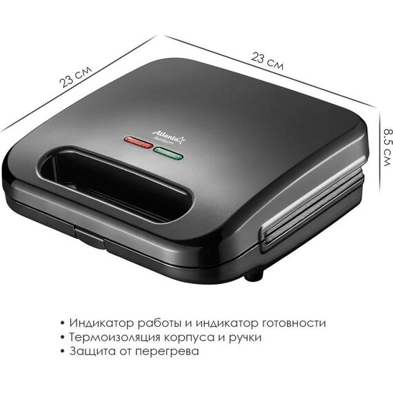 ATLANTA ATH-1058 (BLACK) 3 вида насадок: сэндвичи, гриль, вафли, антипригарное покрытие, защита от перегр., 750 Вт. Быстрый Высокая мощность прибора позволяет в кратчайший срок набрать рабочую температуру и приступить к работе. О готовности сэндвичницы к работе Вы можете судить по специальному индикатору готовности. Антипригарное покрытие Рабочая поверхность сэндвичницы покрыта тефлоном, что гарантирует высокие потребительские свойства изделия и легкую чистку, в большинстве случаев Вам придется только смахнуть крошки. Безопасность Прибор имеет прекрасную термоизоляцию ручки, что убережет Вас от ожогов во время использования, и двойную систему пожаробезопасности, исключающую перегрев и как следствие, самовозгорание прибора.