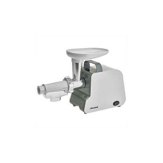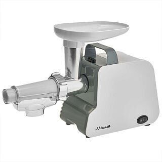 Параметры Максимальная мощность 2000 Вт Номинальная потребляемая мощность 300 Вт Производительность 2 кг/мин Описание Электромясорубка предназначена для измельчения мяса и других видов продуктов, также используется для изготовления колбасок, лапши, спагетти, печенья, сока из мягких фруктов и овощей Подходит для обработки любого вида мяса Цвет: белый с серым Прочный металлический привод шнека увеличивает надежность и долговечность прибора Нож из высококачественной нержавеющей стали Две решетки для измельчения и рубки с отверстиями различного диаметра (5 и 7 мм) Загрузочный лоток из нержавеющей стали Насадка для приготовления томата Две насадки «КУББЕ» Насадка для набивки колбас Удобный толкатель Противоскользящие ножки Функция РЕВЕРС обеспечивает простоту очистки шнека при забивании продуктами Система защиты двигателя от перегрева