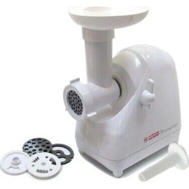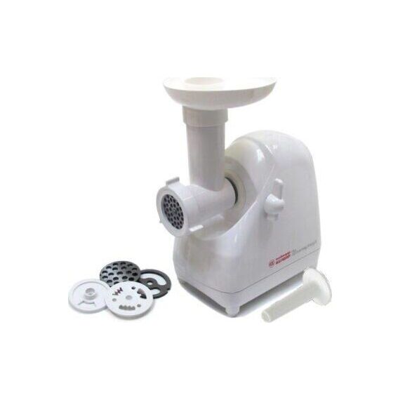 Белый мощность: 220 Вт система реверса: есть насадки: насадка для приготовления колбас, насадка для нарезки печенья, диск для фарша материал корпуса: пластик особенности: мытье в ПММ