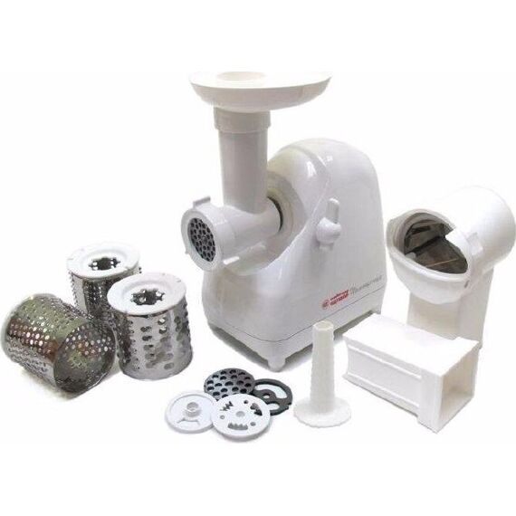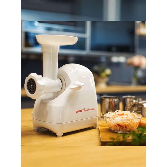 Белый мощность: 220 Вт система реверса: есть насадки: насадка-терка, насадка для приготовления колбас, насадка для нарезки печенья, насадка для шинковки, диск для фарша материал корпуса: пластик особенности: мытье в ПММ, отсек для хранения насадок насадка-соковыжималка для мягких овощей, фруктов и ягод