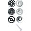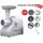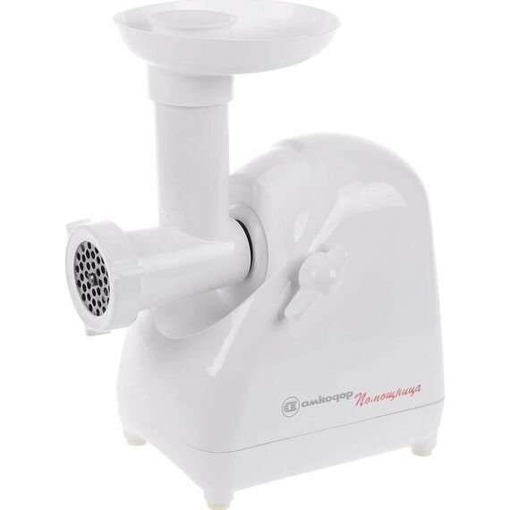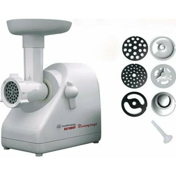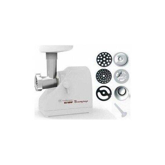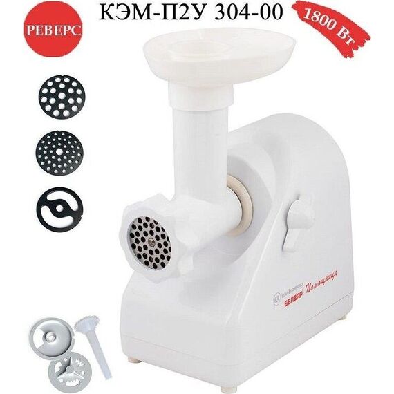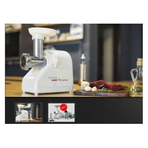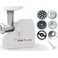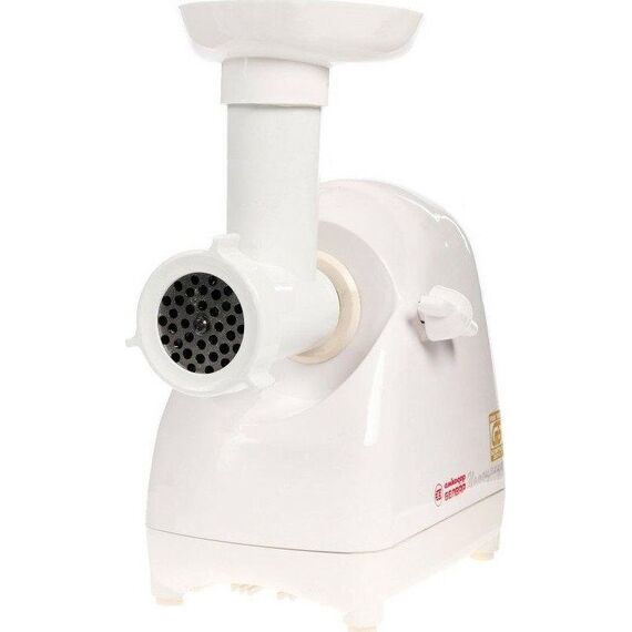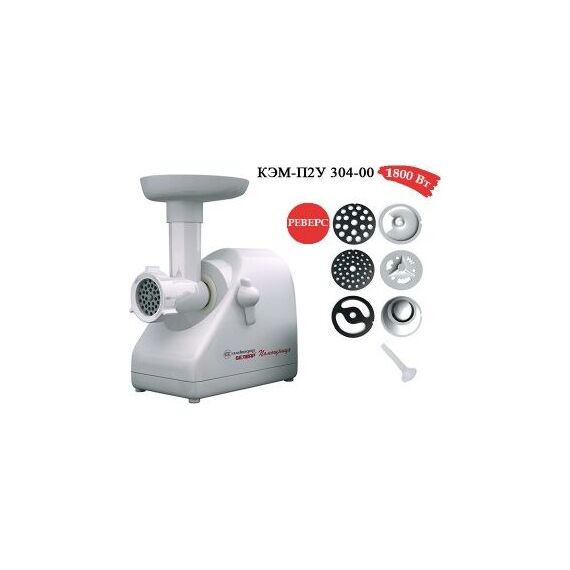 Электромясорубка. Пиковая мощность: 300Вт Номинальная мощность: 1800Вт Реверс: есть Цвет: белый. Количество сменных решеток 2 (крупная, мелкая) . Насадка для набивки колбас. Насадки для профилирования теста. Решетка для "бефстроганов".