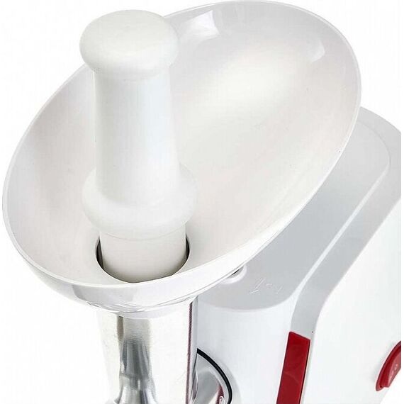 Номинальная потребляемая мощность 2000 Вт, Производительность 1,7 кг/мин, Электромясорубка предназначена для измельчения мяса и других видов продуктов, также используется для изготовления колбасок, лапши, спагетти, печенья, сока из мягких фруктов и овощей, Подходит для обработки любого вида мяса, Цвет: белый с красным , Прочный металлический шнек, Металлический привод шнека увеличивает надежность и долговечность прибора, Крестообразный нож, , Насадка для томатов, Две насадки «КУББЕ», Насадка для набивки колбасок, Удобный толкатель, Противоскользящие прорезиненные ножки, Функция РЕВЕРС обеспечивает простоту очистки шнека при забивании продуктами, Автоматическое отключение при забивании горловины продуктами ,Система защиты двигателя от перегрева.