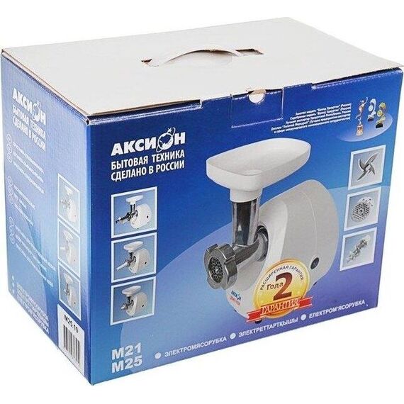 Мясорубка Аксион М 25.10 цвета белый мрамор. Оснащена корпусом и лотком из прочного пластика, устойчивого к ударам и сколам. Вес данной модели равен 3.7 кг. Предусматривается защита от вибраций и надежная установка системы благодаря прорезиненным ножкам. Мощность двигателя достигает до 1500 Вт, что позволяет проводить работы с производительностью до 1.67 кг/мин