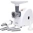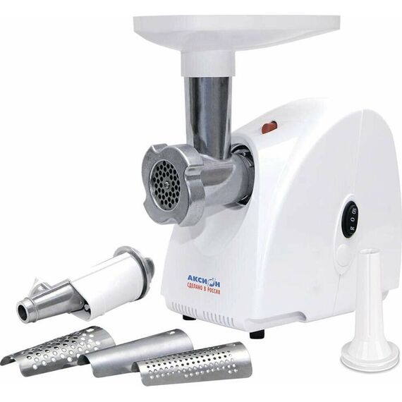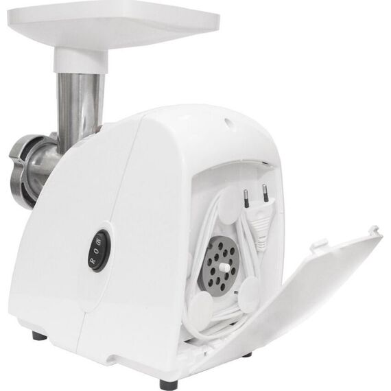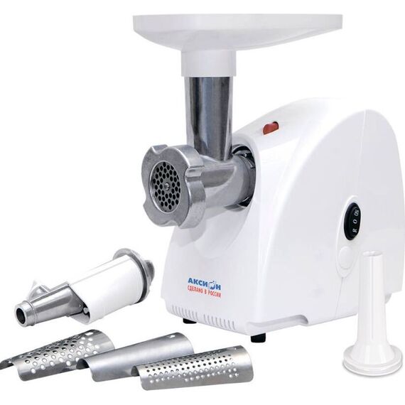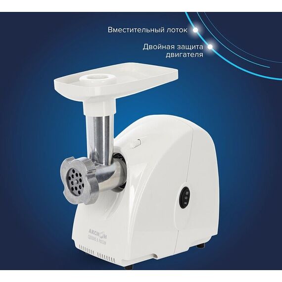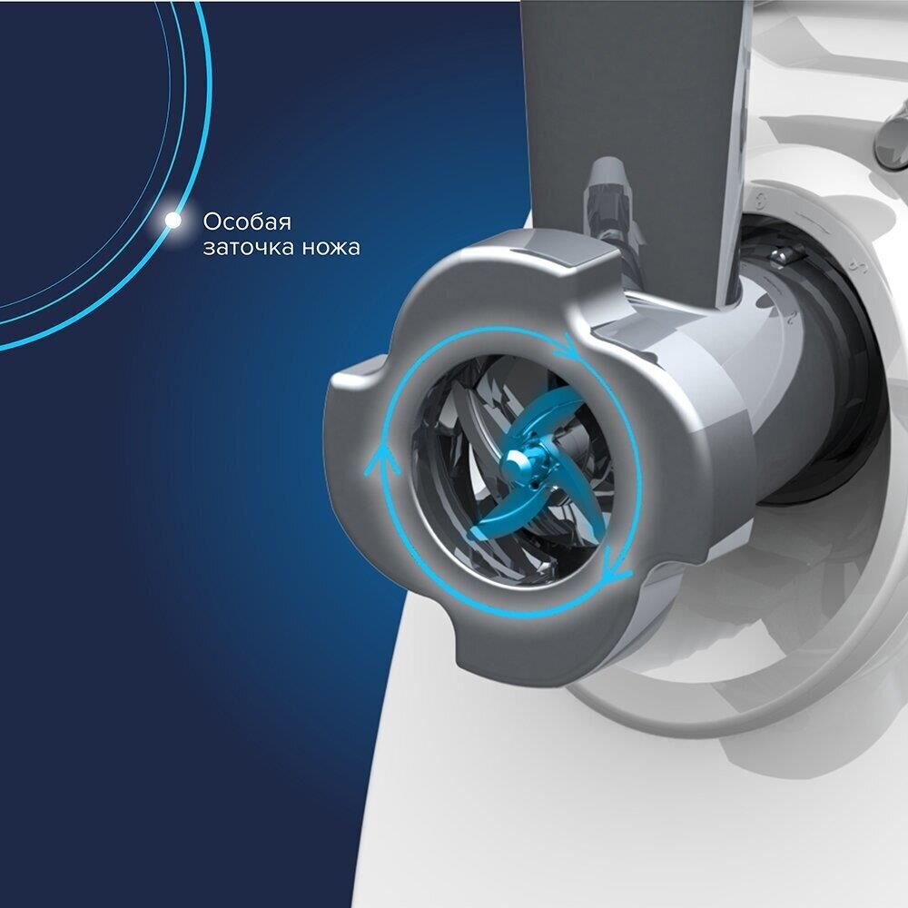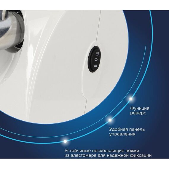 Максимальная мощность 1500 Вт, номинальная мощность 230 Вт, производительность — до 100 кг/час. Функция РЕВЕРС. Комплектуется приставкой — соковыжималкой.; набивки колбасных изделий. Предназначена для получения соков с мякотью из мягких овощей, фруктов, ягод; Защита двигателя от перегрузки; 3 вида решеток для получения фарша разной консистенции - с диаметром отверстий 4,9 мм и 7 мм, а также овальными отверстиями; Удобное хранение ножей и решеток; Высокое размещение шнековой камеры; Функция «реверс» для предотвращения наматывания жилок на шнек; Устойчивые нескользящие ножки для фиксации мясорубки на поверхности стола;