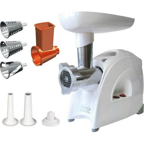 Номинальная потребляемая мощность 300 Вт. Материал корпуса пластик. Панель управления механическая. Длина провода 1,5 м. Материал ножей нержавеющая сталь. Производительность 4 кг/мин. Мощность 2000 Вт. Цвет белый. Производительность — до 3 кг фарша в минуту. Двойная защита от перегрузки. Функция «реверс» для предотвращения наматывания жилок на шнек. Отсек в корпусе для шнура питания, хранения ножа и насадок. Особая заточка ножа и решетки увеличенной толщины из нержавеющей стали, обеспечивающие высокое качество фарша из всех видов мяса и других продуктов. До 30 минут непрерывной работы. 2 вида решеток для получения фарша разной консистенции - с диаметром отверстий 4,9 мм и 8,5 мм. Высокое размещение шнековой камеры. Эргономичная гайка для удобной сборки/разборки мясорубки. Ручка для переноски. Устойчивые нескользящие ножки для фиксации мясорубки на поверхности стола. Возможность вертикального хранения для экономии пространства на кухне.