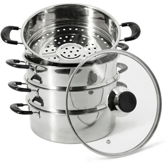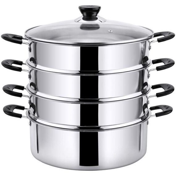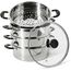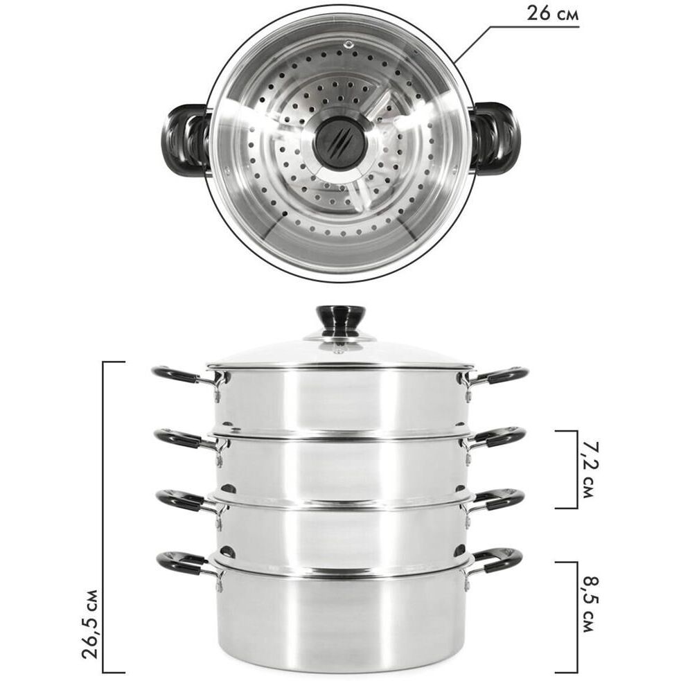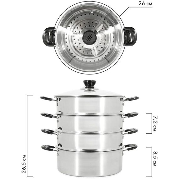 Мантоварка-пароварка Pomi d'Oro P630102 Vapore со стеклянной крышкой. Диаметр 26см. 3 перфорированных яруса, высота 7см. Нижняя часть мантоварки может использоваться как кастрюля, объем 4.7 литра. Изготовлена из высококачественной нержавеющей стали. Безопасна для человека и не выделяет вредных веществ при повышенных температурах. Крышка изготовлена из термостойкого стекла с отверстием для выпуска пара. Не нагревающиеся бакелитовые ручки.
