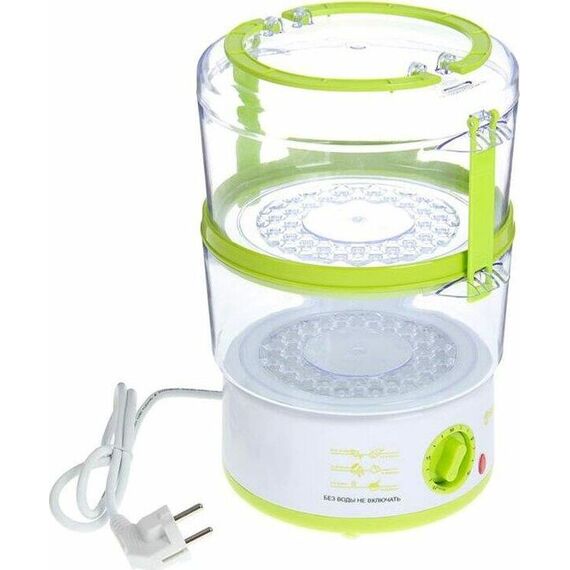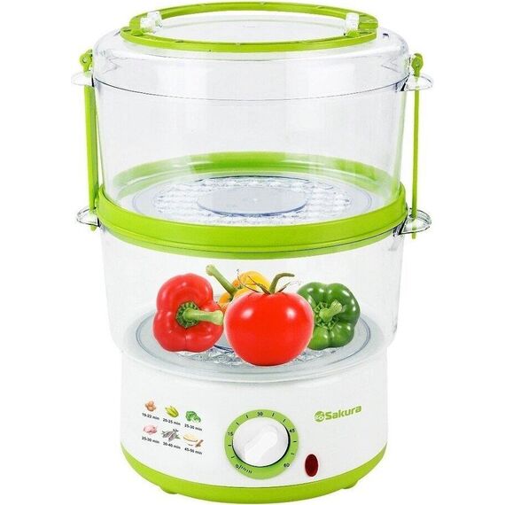 SAKURA SA-7213GR Пароварка электрическая, 5л, 2 яруса Мощность: 500Вт,Объем резервуара для воды: 0,48л,Таймер: 60 минут,Звуковой сигнал при отключении,Долив воды во время приготовления,Отключение без воды,Тип управления: механический