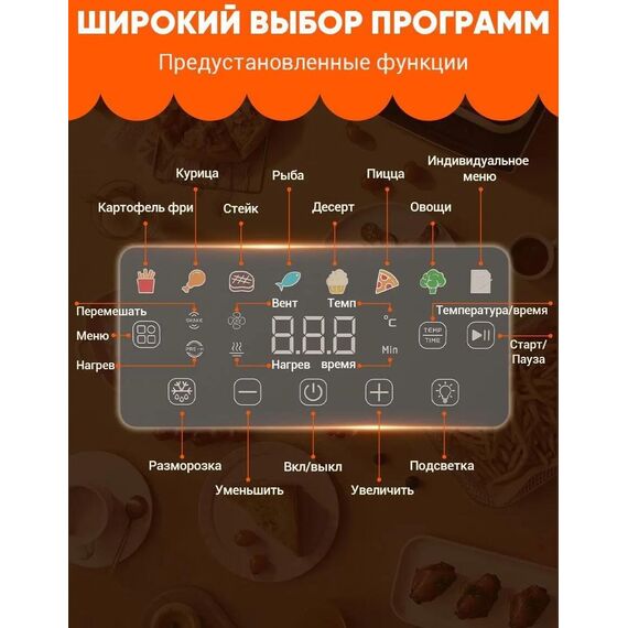 Цвет товара серебристый Мощность 2000 Вт Тип: аэрогриль/аэрофритюрница Тип нагревательного элемента ТЭН Объем чаши 7 л Количество автоматических программ 8 Максимальное время установки таймера 1 ч Регулировка температуры да Тип крышки: на кронштейне Особенности: поддержание тепла, таймер В комплекте: сетчатый противень Размеры и вес Высота 350 мм Ширина 370 мм Глубина 335 мм Вес 5.5 кг