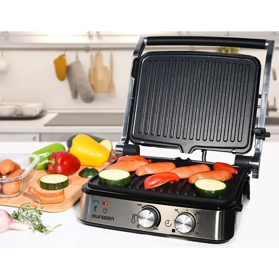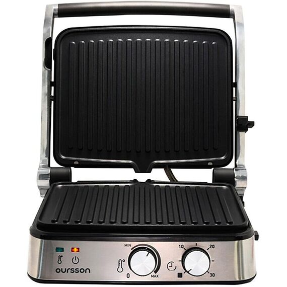 Многофункциональный электрический гриль EG2030S Oursson мощностью 2000 Вт имеет ребристую антипригарную поверхность. Регулировка температуры до 230 градусов и времени приготовления до 30 минут позволит приготовить разнообразные полезные блюда с аппетитной корочкой - мясные и рыбные стейки, горячие бутерброды, бургеры, овощи на гриле, грибы, креветки и т.д. Крышка гриля оснащена регулятором степени закрытия для приготовления блюд различной толщины. Предусмотрена возможность открытия крышки на 180° для обеспечения большей поверхности для жарки. Нагревательные пластины и поддон для сбора жира съемные, их легко мыть. В приборе также предусмотрена фиксация закрытия крышки для компактного хранения. Дополнительно можно приобрести съёмную панель-гриль (DP2030G) и съёмную панель-вафельницу (DP2030W).