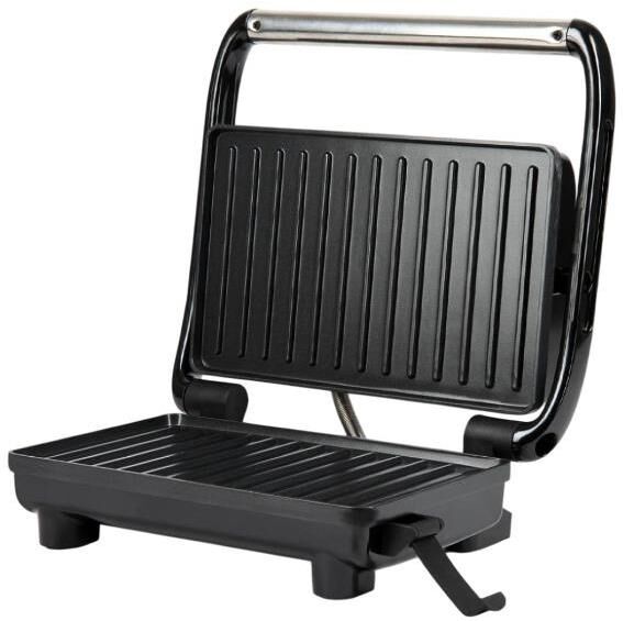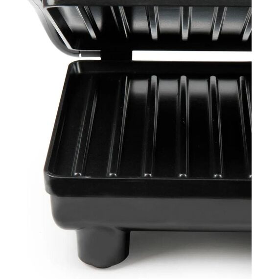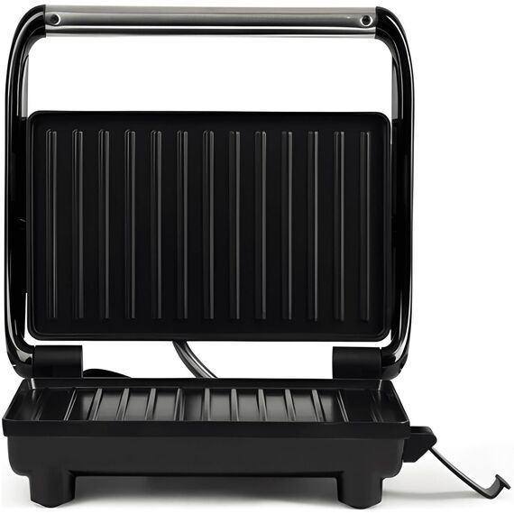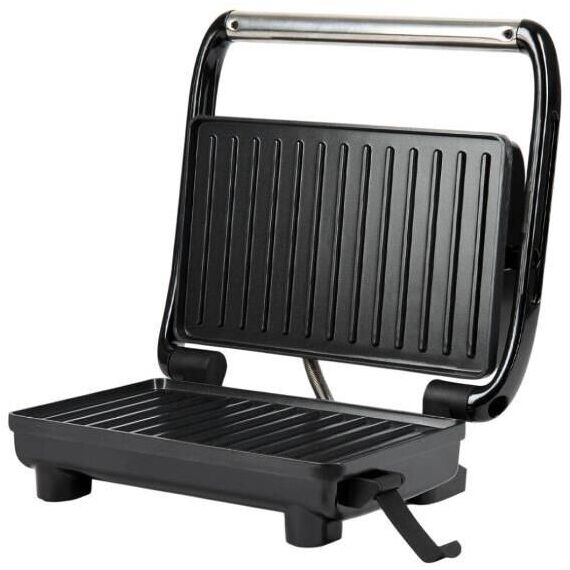 Гриль электрический, мощность 850 Вт, размер панелей 23х14,5 см, антипригарное покрытие, открытие панелей на 90°, автоматический термостат: 150 – 200 °С, индикатор готовности, прорезиненные ножки. Корпус из термостойкого пластика с нержавеющей сталью.