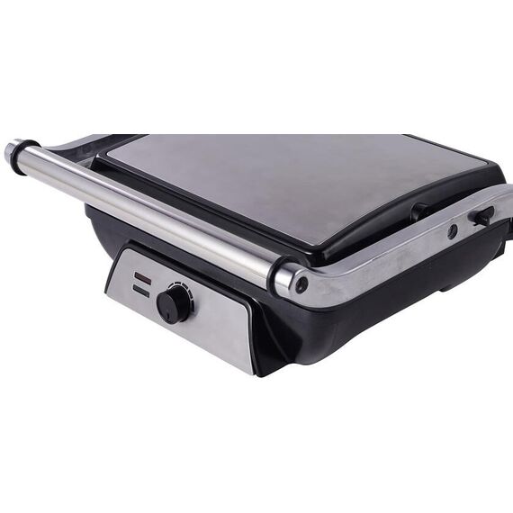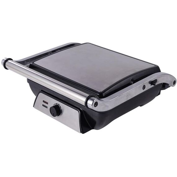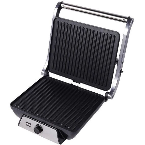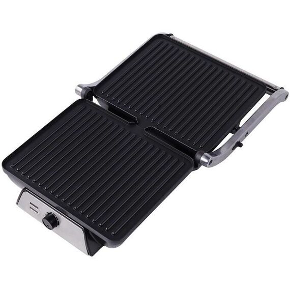 Гриль электрический, мощность 2000 Вт, регулируемый термостат (максимальная температура 240°С), 2 рифленые панели для жарки, размер панели 29,7х23,6 см, антипригарное покрытие, открытие панелей на 180° (возможность приготовления на 2 пластинах одновременно), индикатор работы, прорезиненные ножки. Корпус из нержавеющей стали и термостойкого пластика. Комплектация: резервуар для сбора масла.