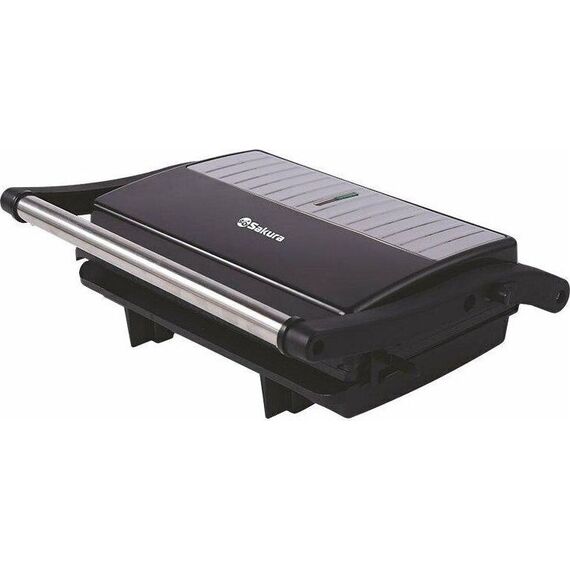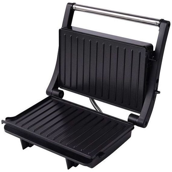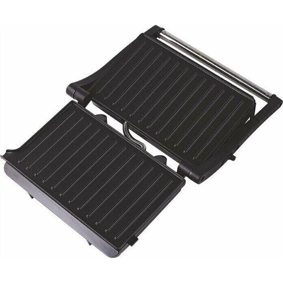 Гриль электрический, мощность 1000Вт, 2 рифленые панели для жарки, размер панели 23.1х14.6 см, антипригарное покрытие, открытие панелей на 180° (возможность приготовления на 2 пластинах одновременно), индикатор работы, прорезиненные ножки. Корпус из нержавеющей стали и термостойкого пластика.