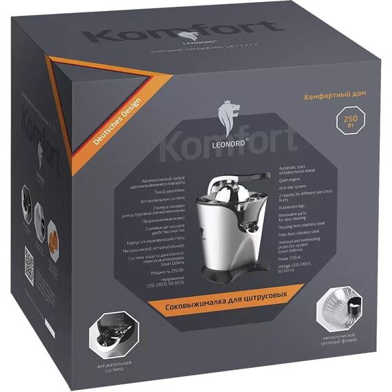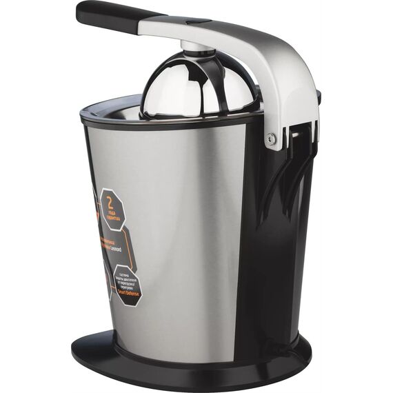 Автоматический запуск двухнаправленного поворота Тихий двигатель Антикапельная система Прорезиненные ножки Съемные детали для удобства очистки 2 конуса-насадки для цитрусовых разной величины Корпус из нержавеющнй стали Металлический сетчатый фильтр Система защиты двигателя от перегрузки/перегрева Smart Defense Мощность 250 Вт Напряжение 220-240В, 50-60Гц 2 года гарантии Длина шнура 1,2 м
