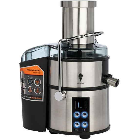 Центробежная соковыжималка Мощность 800Вт LED дисплей Электронное управление 5 скоростей Импульсный режим Скорость отжима 18 000 оборотов в минуту Автоматическая блокировка работы при неправильной сборке Система защиты двигателя от перегрузки/перегрева Smart Defense Диаметр подающей трубки 85 мм Корпус и микрофильтр из нержавеющей стали Стакан для сока 1,1л Контейнер для жмыха 2 л Прорезиненные ножки против скольжения 2 года гарантии