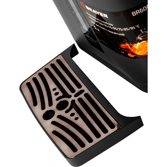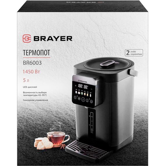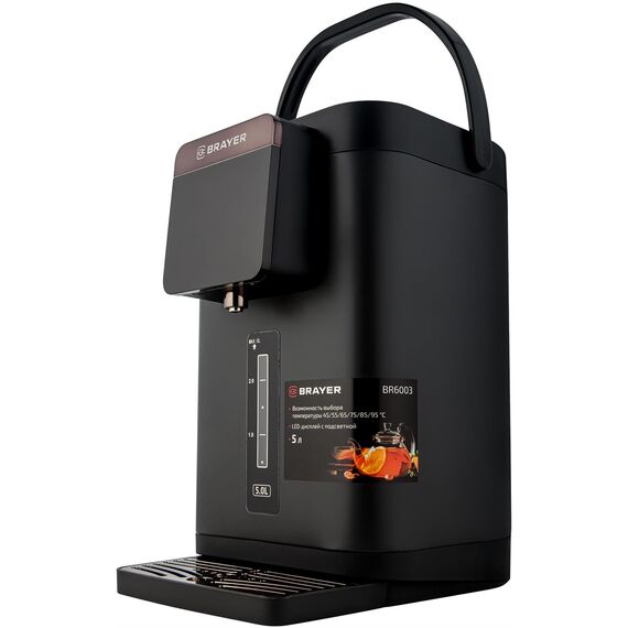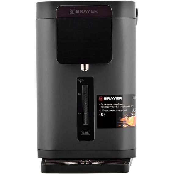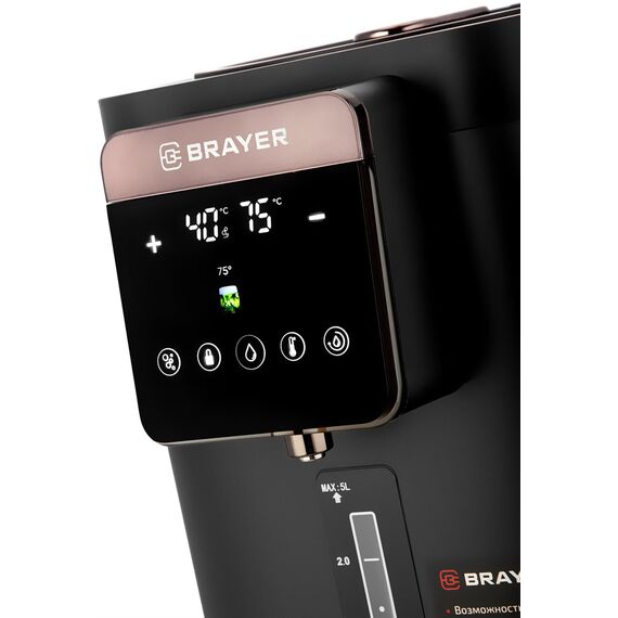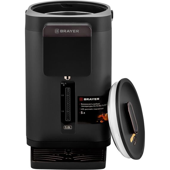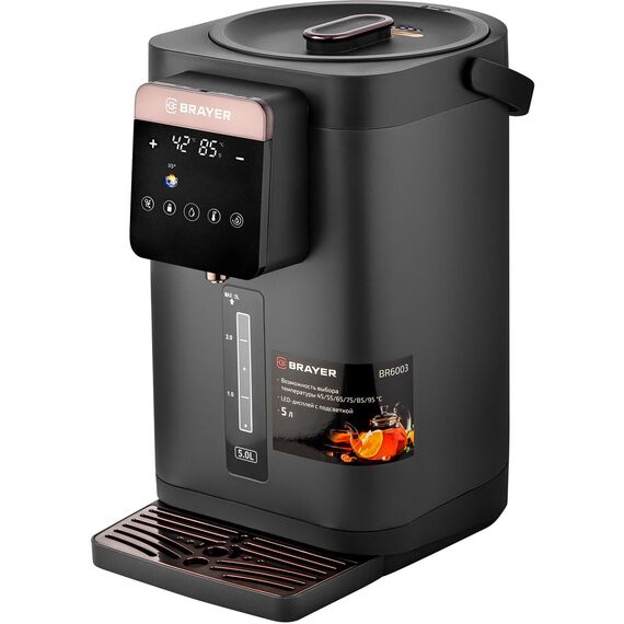 Максимальная мощность 1450 Вт Максимальный объем 5 л Подача воды с помощью автоматической помпы Поддержание температуры воды для разных напитков (45°/55°/65°/75°/85°/95°С) Функция повторного кипячения Функция поддержания температуры воды Сенсорное управление LED-дисплей Блокировка подачи воды Корпус из высококачественного металла Съёмный поддон для капель Автоотключение при отсутствии воды Электропитание 220-240 В, ~ 50-60 Гц