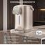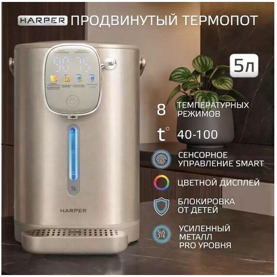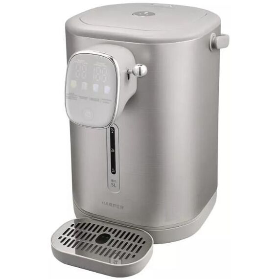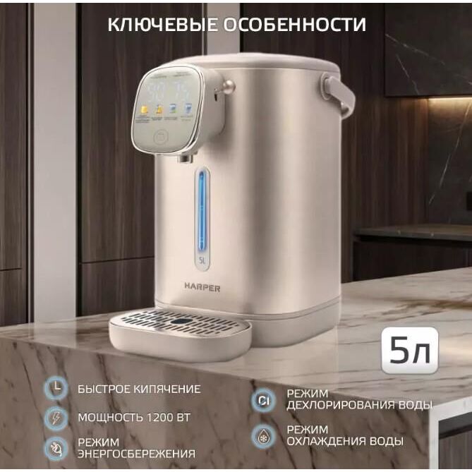 Полезный объем: 5л Потребляемая мощность: 1200 Вт Питание: 220-240В 50-60Гц Поддержание температуры: 40С°, 45С°,50С°,60С°, 70С°, 80С°, 90С°, 100С° Количество температурных режимов: 8 Количество способов подачи воды: 1 Блокировка подачи воды: да Шкала уровня воды: да Автоматическая помпа: да Дисплей: да Сенсорное управление: да Индикация включения: да Индикация заданной температуры : да Индикация текущей температуры: да Индикатор отмены установки температуры: да Индикатор выключения подогрева: да Функция автоматического кипячения: да Функция повторного кипячения: да Режим термоса: да Режим чистой/водопроводной воды: да Защита от перегрева: да Защита от детей: да Съемная крышка: да Защита от включения без воды: да Подставка под чашку: да Материал корпуса: металл / пластик Материал внутренней колбы: Нержавеющая сталь SUS316 Длина сетевого шнура: 1,2м Комплектация: Термопот, подставка, шнур питания, инструкция, гарантийный талон. Цвет: светло-золотистый Размеры (ШхВхГ): 249х341х349 мм Вес: