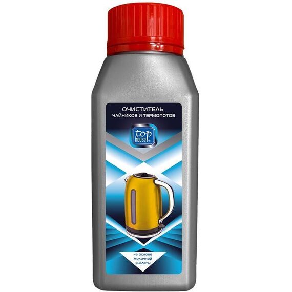TOP HOUSE Очиститель накипи для чайников и термопотов, 250 мл. Быстро и эффективно удаляет накипь. Бережно очищает внутренние детали приборов. Благодаря жидкой форме за одно применение полностью удалит накипь и известковые отложения с внутренних деталей кофеварок и кофемашин.