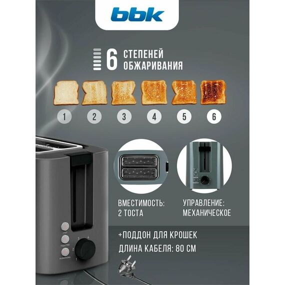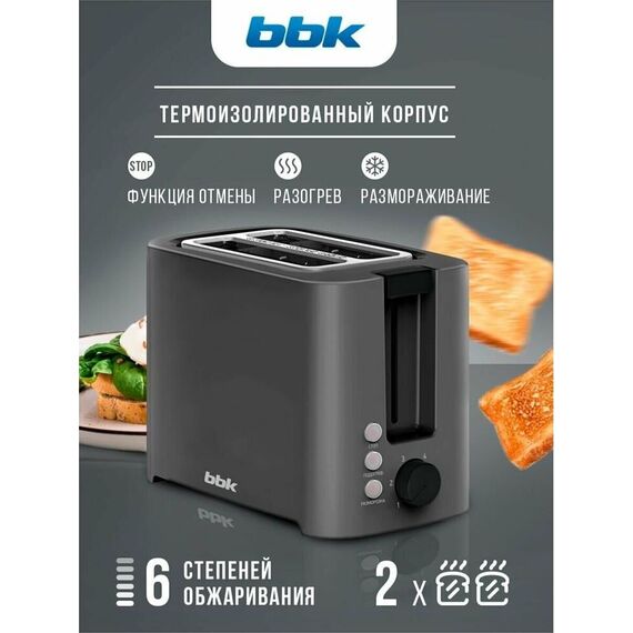 Мощность 800Вт; Отделения для двух тостов; 6 режимов приготовления; Клавиша отмены; Функция подогрева, Функция разморозки. Регулировка степени поджаривания; Термоизолированный корпус; Защита от перегрева; Съемный поддон для крошек