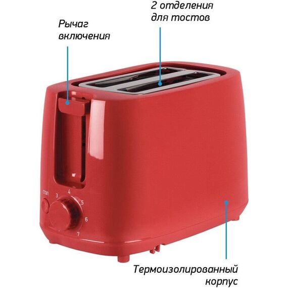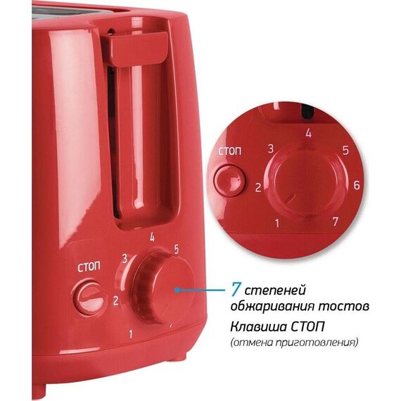 Индикатор питания Да. Тип управления механический. Максимальная мощность (Вт) 700. Защита от перегрева Да. Регулировка степени поджаривания 7. Отмена Да. Тостер 1. Поддон для крошек 1. Количество тостов 2. Материал корпуса Пластик.