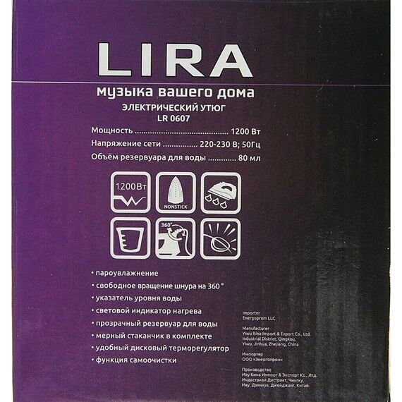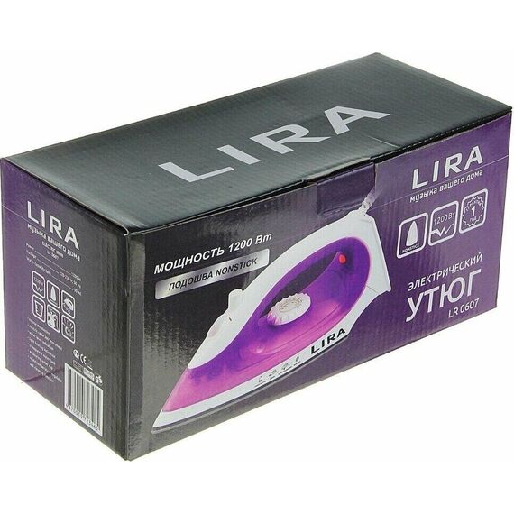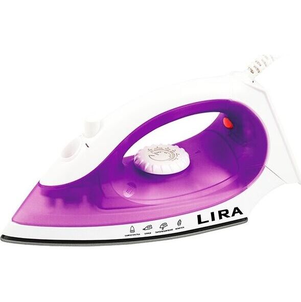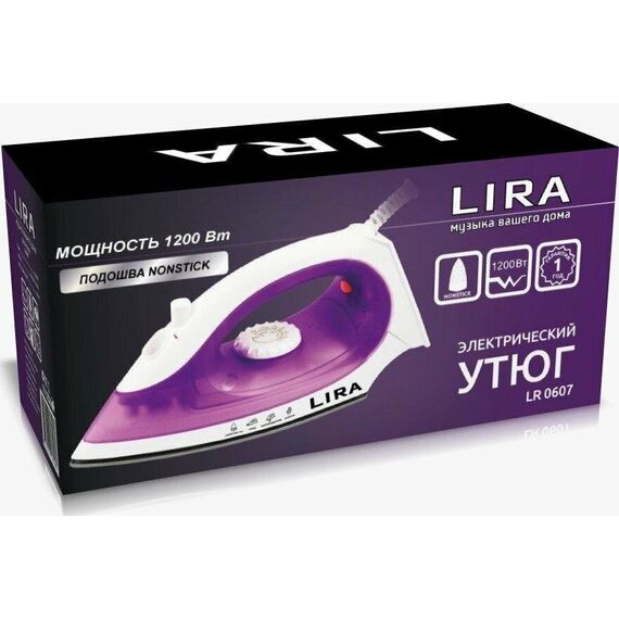 Покрытие подошвы: non-stick, Цвет: белый + фиолетовый, Мощность: 1200 Вт, Напряжение сети: 220 В, Функции: - сухое глажение, - пароувлажнение, - самоочистка, Прозразный резервуар для воды 80 мл, Световой индикатор нагрева, Дисковый терморегулятор, Защита от перегрева, Мерный стакан, Длина шнура питания 1,5 м.