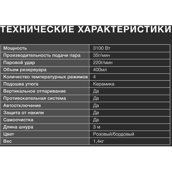Мощность 3100 Вт Производительность подачи пара 35 г/мин Паровой удар 200 г Емкость для воды 400 мл Подошва утюга керамическая Enviro Ceramic Вертикальное отпаривание ДА Распылитель воды ДА Противокапельная система ДА Автоотключение ДА Самоочистка от накипи ДА Длина шнура 3 м Мерный стаканД А Особенности LED индикация