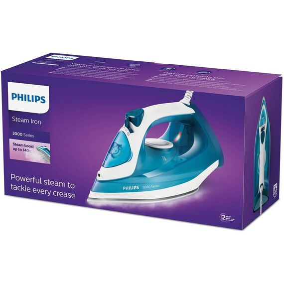 Паровой утюг 3000 series, 2100 Вт, подача пара 30г/мин, паровой удар 140г, керамическая подошва. Объем резервуара для воды 300 мл, Готовность к использованию 35 сек, распылитель, система "капля-стоп", вертикальное отпаривание, настройка подачи пара, своб